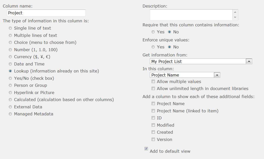 In the Columns section choose Add Column and configure a new column named "Project" as shown below;