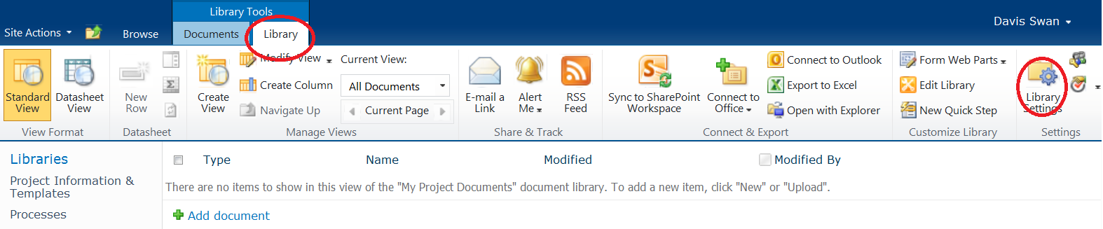 icon towards the upper left part of the screen. In the next screen enter a name such as "My Project Library" in the entry box on the right hand part of the screen and choose "Document Library"